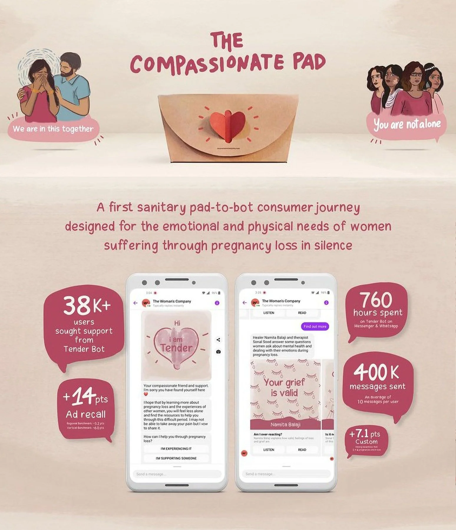 In tandem, the pad also provides access to a messaging Bot - 'TENDER.' Tender, a compassionate, virtual friend, connects women experiencing this inexplicable loss (and the people supporting her) to a qualified panel of specialists like gynecologists, counsellors, doulas, fitness and nutrition professionals to get expert guidance and support.